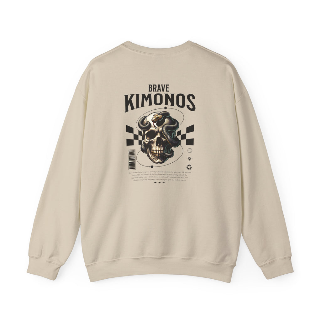 Soft, lived-in comfort meeting bold, graphic attitude. This crewneck brings a muted, sandy canvas together with stark black artwork — a compact, vintage-style logo on the front and a larger, gritty skull-and-checkerboard composition across the back. Wear it as an everyday layer: over a tee for dropped-shoulder ease or under a jacket when the air cools. The weight and cotton-poly blend give it structure without stiffness, while the ribbed collar and cuff keep the silhouette neat after repeated wear. It reads like a sketchbook page come to life: tactile, slightly rebellious, and quietly intentional — for people who like their style to say something without shouting.